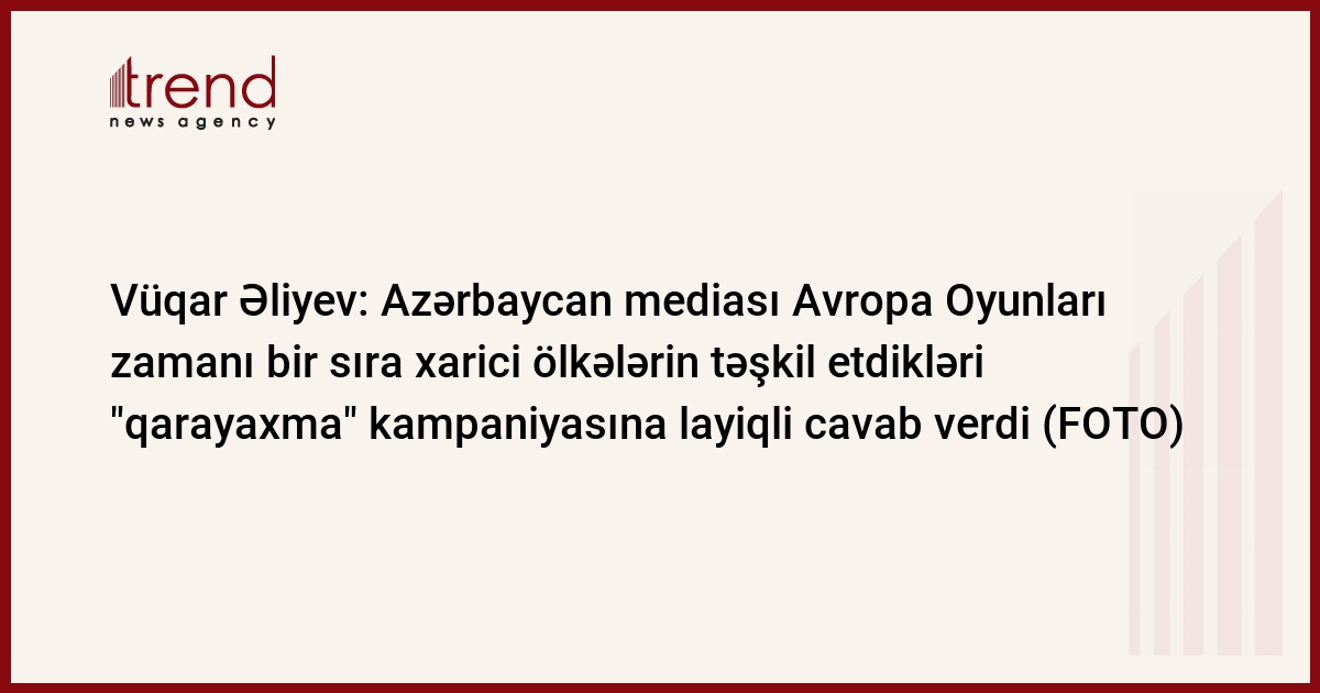 V.Əliyev Azərbaycanda güclü medianın formalaşdığını bildirərək deyib: "Biz bunu Bakıda keçirilən birinci Avropa Oyunları zamanı aydın müşahidə etdik. Azərbaycan jurnalistləri əsl peşəkarlıq nümayiş etdirərək dövlətimizi layiqincə dəstəklədilər. Azərbaycan mediası Avropa Oyunları zamanı bir sıra xarici ölkələrin təşkil etdikləri "qarayaxma" kampaniyasına layiqli cavab verdi".