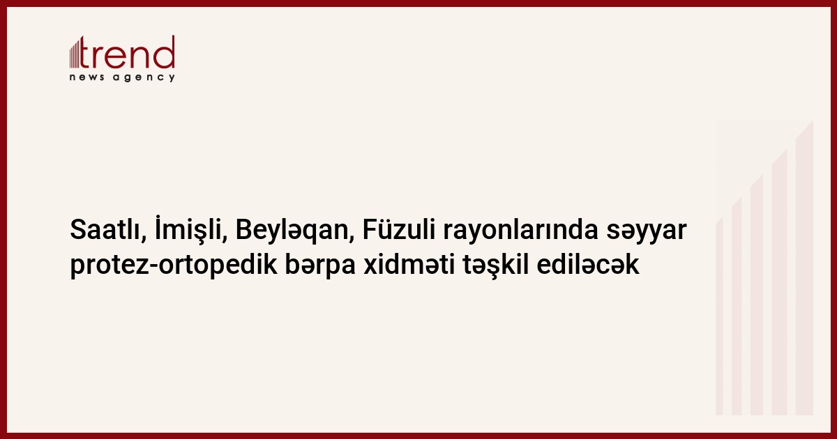 Əmək və Əhalinin Sosial Müdafiəsi Nazirliyi (ƏƏSMN) Saatlı, İmişli, Beyləqan, Füzuli rayonlarında səyyar protez-ortopedik bərpa xidməti təşkil edəcək.