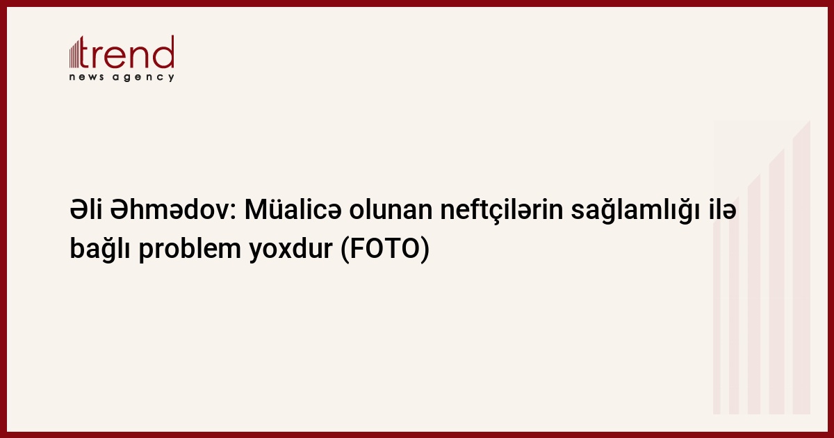 Müalicə olunan neftçilərin sağlamlığı ilə bağlı hər hansı problem yoxdur. Trend-in məlumatına görə, bunu jurnalistlərə Baş nazirin müavini Əli Əhmədov Mərkəzi Neftçilər Xəstəxanasında müalicə olunan neftçilərə baş çəkərkən deyib.