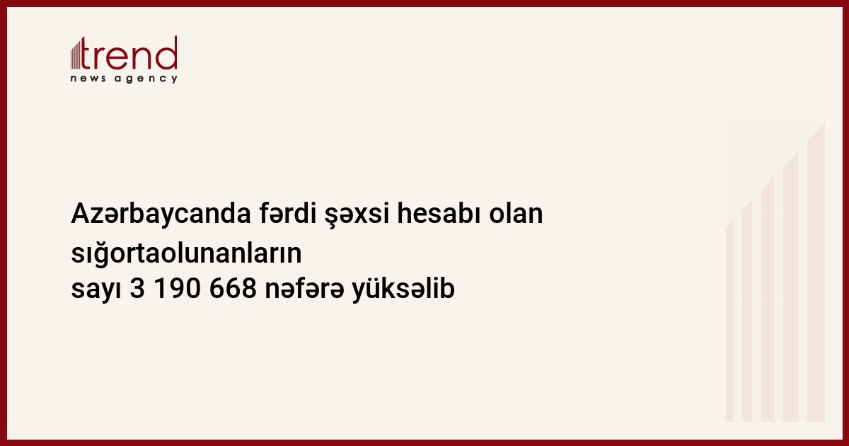 Dövlət Sosial Müdafiə Fondunun İctimaiyyətlə əlaqələr sektorundan Trend-ə verilən məlumata görə, cari ilin əvvəli ilə müqayisədə Dövlət Sosial Müdafiə Fondunun fərdi uçot sistemində qeydiyyatda olan sığortaolunanların sayı 0,33 faiz artıb. Beləliklə də Azərbaycanda fərdi şəxsi hesabı olan sığortaolunanların sayı 3 190 668 nəfərə yüksəlib. Dövlət Sosial Müdafiə Fondunun fərdi uçot sistemində qeydiyyatda olan sığortaolunanların 59,22 faizi (1 889 443 nəfər) kişi, 40,78 faizi (1 301 225 nəfər) isə qadındır.