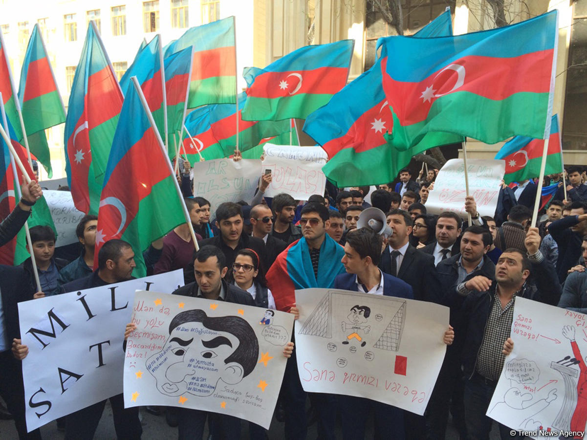 Trend-in məlumatına görə, aksiyada gənclər Ə.Kərimlinin sosial şəbəkədə qeyd etdiyi antiazərbaycan fikirlərinə etirazlarını ifadə edərək müxtəlif şüarlar səsləndiriblər.