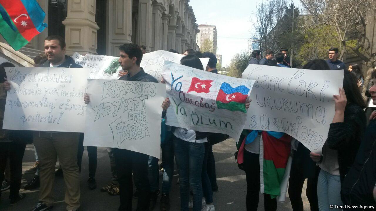 Trend-in məlumatına görə, aksiya iştirakçıları Ə.Kərimlinin sosial şəbəkədə qeyd etdiyi antiazərbaycan fikirlərinə etirazlarını ifadə edərək müxtəlif şüarlar səsləndiriblər.