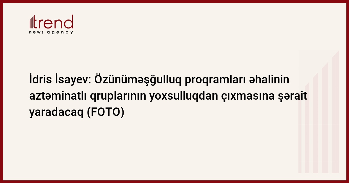 Geniş əhali kateqoriyalarını əhatə edən sosial təminat sisteminə malik Azərbaycanda aparılan sosial siyasətin əsas hədəflərindən biri də aztəminatlı ailələr üçün dayanıqsız passiv sosial təminat tədbirlərindən dayanıqlı aktiv məşğulluq proqramlarının tətbiqinə keçidin təmin edilməsidir. Əmək və Əhalinin Sosial Müdafiəsi Nazirliyinin İctimaiyyətlə əlaqələr şöbəsindən Trend-ə verilən məlumata görə, bunu Azərbaycan Respublikası əmək və əhalinin sosial müdafiəsi nazirinin müavini İdris İsayev Nobel Sülh Mükafatı Laureatı Məhəmməd Yunusun iştirakı ilə Azərbaycan İqtisad Universitetində keçirilən konfransda “Yoxsulluğun azaldılmasında özünüməşğulluq tədbirlərinin rolu” mövzusunda çıxışı zamanı bildirib.