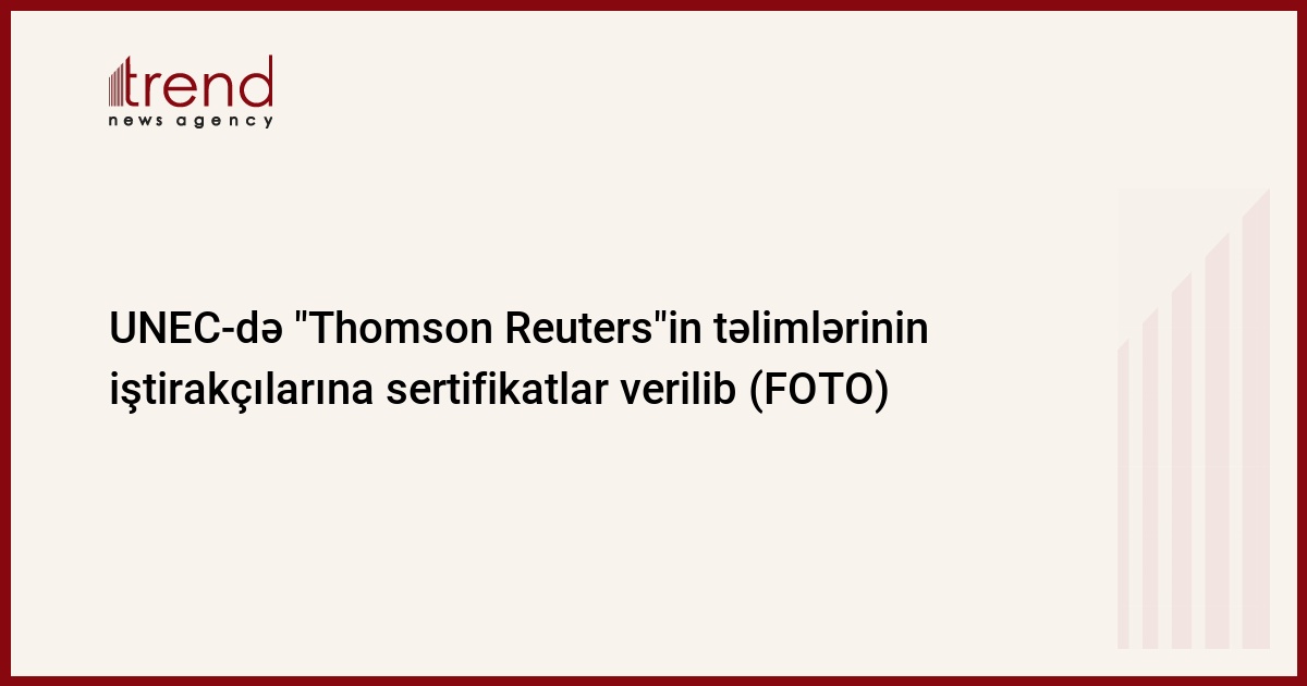 Universitetdən Trend-ə verilən məlumata görə, dünyanın aparıcı informasiya agentliyi olan “Thomson Reuters” şirkətinin təlimləri Azərbaycan ali təhsil müəssisələri arasında ilk dəfə UNEC-də təşkil olunub. Təlimlərdə “Thomson Reuters”in nümayəndələri iştirakçılara “Web of Science” platformasından istifadə qaydalarını öyrədib. Təlimdə UNEC-lə yanaşı, Milli Aviasiya Akademiyası, ADA Universiteti, Memarlıq və İnşaat Universiteti və Azərbaycan Dillər Universitetinin nümayəndələri də iştirak ediblər.