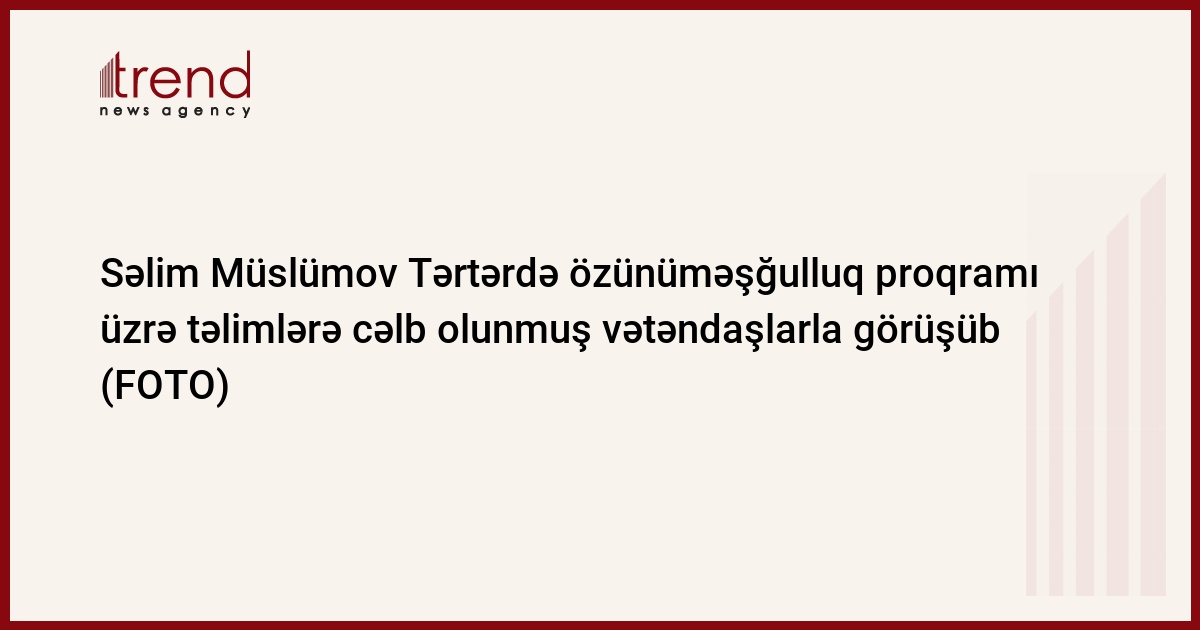 Əmək və əhalinin sosial müdafiəsi naziri Səlim Müslümov Tərtər rayonunda özünüməşğulluq proqramında iştirak etmək üçün müraciət edən və özünüməşğulluq üzrə təlimlərə cəlb olunmuş vətəndaşlarla görüşüb.