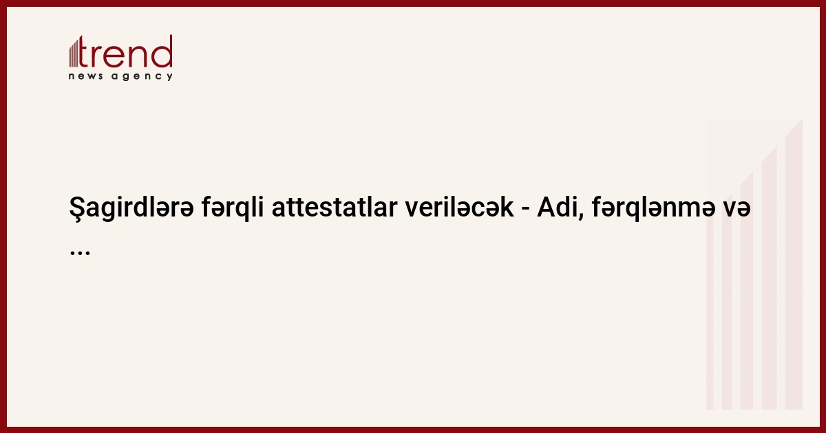 Azərbaycanda orta məktəbi bitirən şagirdlərə verilən təhsil sənədləri fərqləndiriləcək, onlara adi, fərqlənmə və xüsusi nümunəli attestatlar veriləcək.