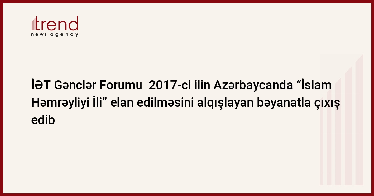 Sonda, sözügedən bəyanatda İƏT Gənclər Forumu İƏT Müştərək Gənclər Fəaliyyətləri daxil olmaqla öz layihə və proqramlarını 2017-ci il Azərbaycanda “İslam Həmrəyliyi İli” çərçivəsinə uyğun icra edərək Azərbaycan gənclərinin inkişafı, İslam həmrəyliyi və qlobal gənclər dialoqunun gücləndirilməsi məqsədilə Azərbaycan Hökuməti ilə əməkdaşlığı daha da inkişaf etdirməyə hazır olduğunu bildirib.