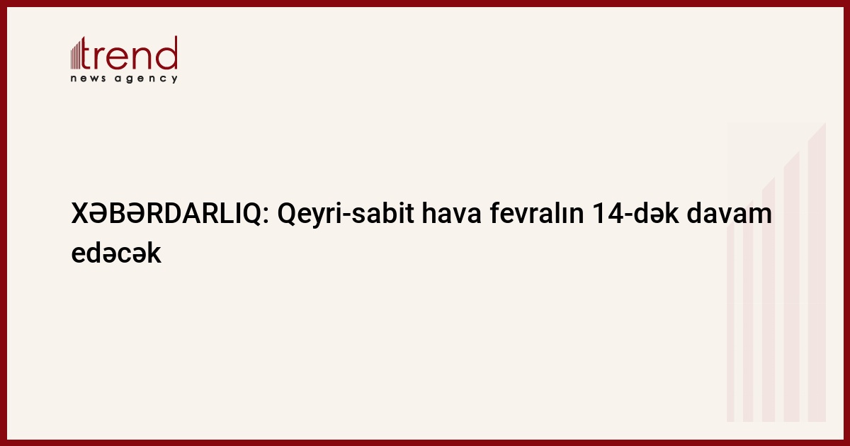 Ölkə ərazisində qeyri-sabit hava şəraiti fevralın 14-ü gündüzədək davam edəcək. Arabir yağıntılı olacağı, qar yağacağı gözlənilir. Ayrı-ayrı yerlərdə intensiv olacağı ehtimalı var. Əsasən dağlıq və dağətəyi rayonlarda yolların buz bağlama ehtimalı var.