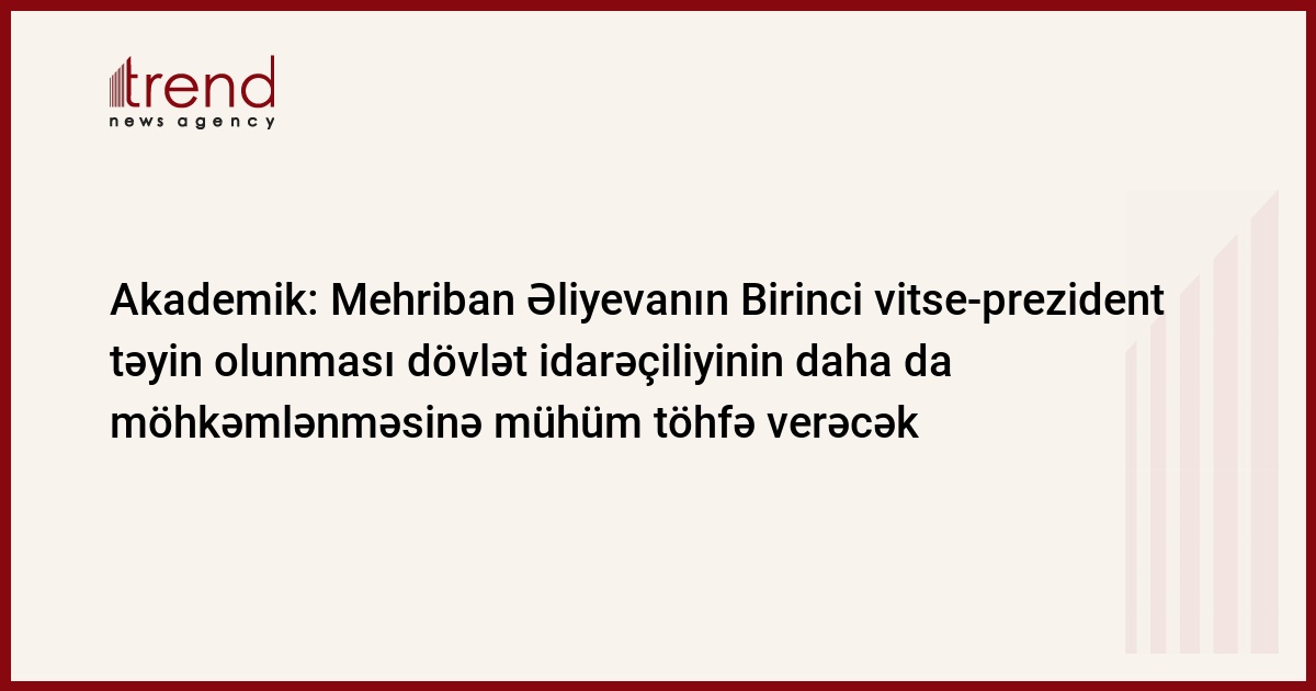 Akademik bildirib ki, Mehriban xanım Əliyevanın Birinci vitse-prezident təyin olunması dövlət idarəçiliyinin daha da möhkəmlənməsinə mühüm töhfə verəcək.