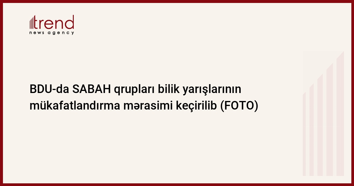 Bu gün Bakı Dövlət Universitetində Təhsil Nazirliyinin SABAH qrupları layihəsi çərçivəsində bu ilin mart - aprel ayları ərzində Azərbaycan Xalq Cümhuriyyətinin 100 illiyinə həsr olunmuş riyaziyyat, müəllimlik və informasiya texnologiyaları ixtisasları üzrə bilik yarışlarının yekun mükafatlandırma mərasimi keçirilib.