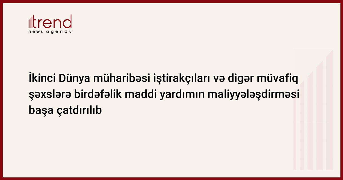 İkinci Dünya müharibəsi iştirakçıları və digər müvafiq şəxslərin birdəfəlik maddi yardımla təmin olunması üçün maliyyələşdirmə işləri başa çatdırılıb