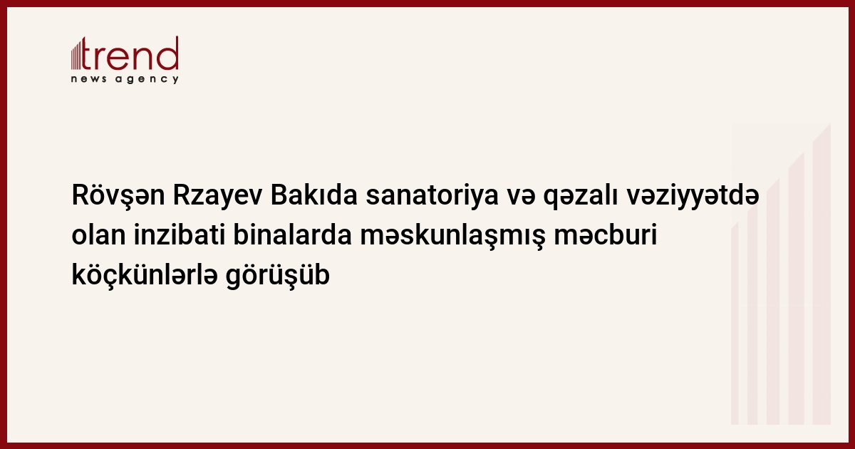 Qaçqınların və Məcburi Köçkünlərin İşləri üzrə Dövlət Komitəsinin sədri Rövşən Rzayev mayın 16-da Dövlət Komitəsinin sədr müavinləri ilə birgə Bakının Xəzər rayonunda bir neçə sanatoriya və qəzalı vəziyyətdə olan inzibati binalarda məskunlaşmış məcburi köçkünlərlə görüşüb.