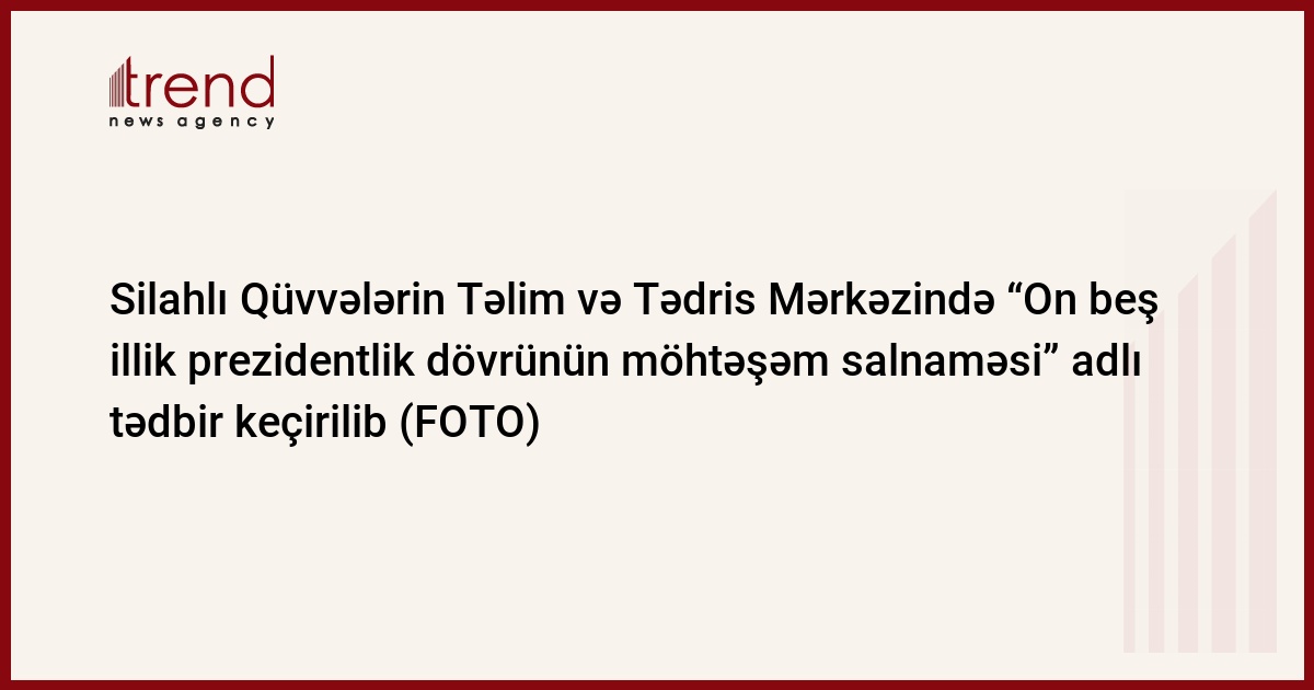 Dövlətimizin başçısı, Silahlı Qüvvələrin Ali Baş komandanı İlham Əliyevin prezidentlik fəaliyyətinin 15 illiyi ilə bağlı Azərbaycan Ordusunun birlik, birləşmə, hərbi hisslərində və xüsusi təyinatlı təhsil müəssisələrində silsilə tədbirlər həyata keçirilir.
