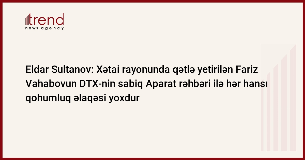 Baş Prokurorluğun Mətbuat xidmətinin rəhbəri Eldar Sultanov Trend-ə bildirib ki, Bakının Xətai rayonunda qətlə yetirilən ləğv edilmiş MTN-in sabiq əməkdaşı Fariz Vahabovun Dövlət Təhlükəsizliyi Xidmətinin (DTX) sabiq Aparat rəhbəri Fərhad Vahabovla hər hansı qohumluq əlaqəsi yoxdur.