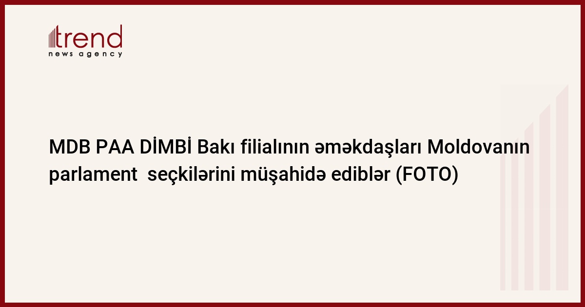 Moldova Respublikasının parlament seçkilərinin təşkili və keçirilməsinin müşahidəsi məqsədilə Moldova Respublikasının Mərkəzi Seçki Komissiyasında beynəlxalq müşahidəçi qismində qeydiyyatdan keçmiş MDB Parlamentlərarası Assambleyasının iştirakçısı olan dövlətlərdə Demokratiyanın, parlamentarizmin inkişafının və vətəndaşların seçki hüquqlarına riayət olunmasının monitorinqi Beynəlxalq institutunun Bakı filialının (MDB PAA DİMBİ ) əməkdaşları Moldova Respublikasının Bakı şəhərində yerləşən səfirliyində təşkil olunmuş seçki məntəqəsində səsvermənin gedişini müşahidə ediblər.