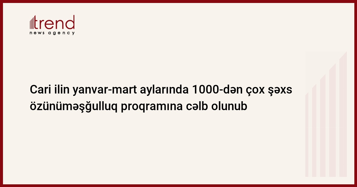 Əmək və Əhalinin Sosial Müdafiəsi Nazirliyi yanında Dövlət Məşğulluq Xidməti tərəfindən 2019-cu ilin birinci rübü ərzində 1000-dən çox işsiz və işaxtaran şəxs özünüməşğulluq proqramına cəlb olunub.