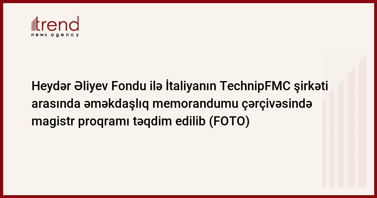 Trend-in məlumatına görə, Heydər Əliyev Fondu ilə İtaliyanın neft və qaz şirkəti-TechnipFMC arasında əməkdaşlıq memorandumu çərçivəsində neft-qaz sahəsində çalışan tələbələr üçün magistr proqramı üzrə bilik və bacarıqlarının təkmilləşdirilməsi tədbirlərinin keçirilməsi, elm, texnologiya və təhsil sahələrində birgə layihələrin icrası nəzərdə tutulur.