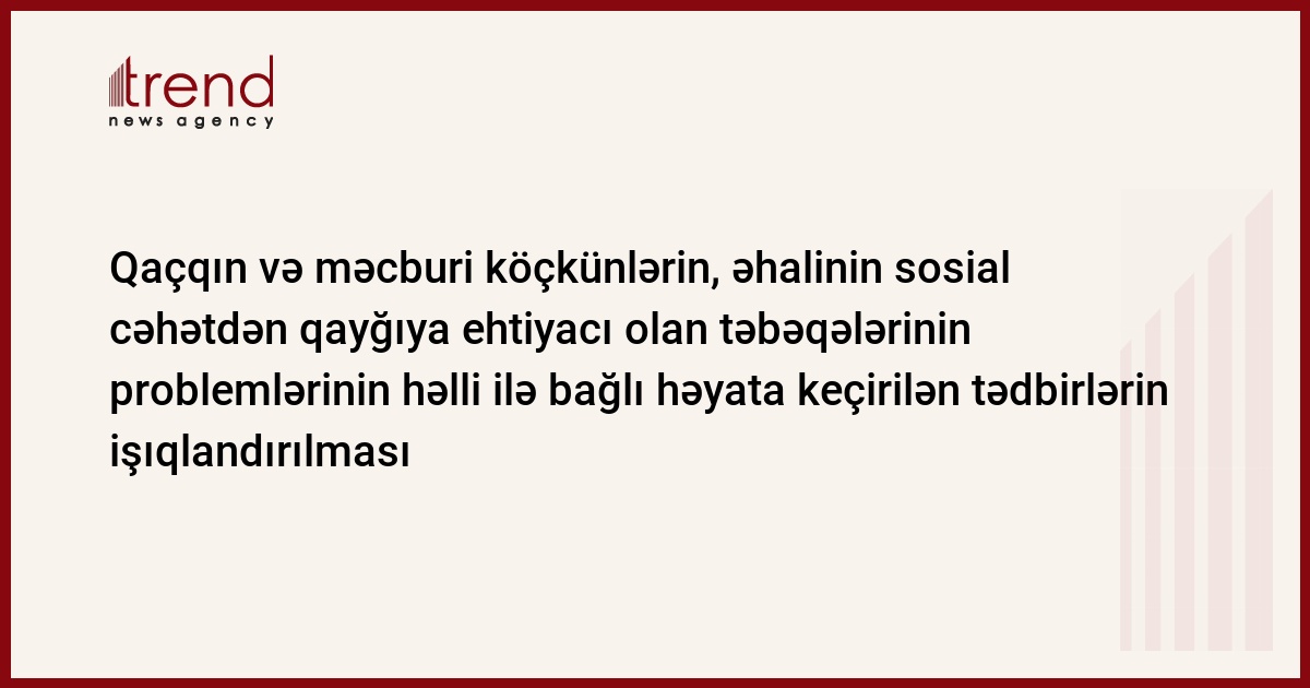 Onun sözlərinə görə, Dağlıq Qarabağ bölgəsinin və 7 ətraf rayonunun Ermənistan tərəfindən işğal edilməsi nəticəsində öz yurd-yuvalarından didərgin düşmüş məcburi köçkünlərin problemlərinin həlli bu gün dövlət siyasətinin prioritetlərindən biridir, onların sosial-iqtisadi vəziyyətinin yaxşılaşdırılması sahəsində davamlı tədbirlər aparılır.