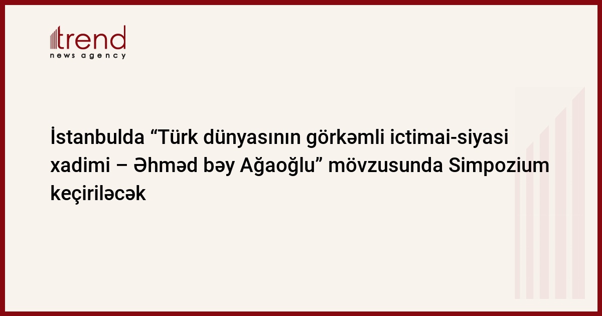 Azərbaycan İlahiyyat İnstitutu (Aİİ), İstanbul Universiteti Türkiyat Araşdırmaları İnstitutu, Türk Əməkdaşlıq və Koordinasiya Agentliyi (TİKA), Türk Ocaqları İstanbul şöbəsinin birgə təşkilatçılığı ilə 20-21 oktyabr 2019-cu il tarixdə İstanbul Universitetində “Türk dünyasının görkəmli ictimai-siyasi xadimi – Əhməd bəy Ağaoğlu” mövzusunda Simpozium keçiriləcək.