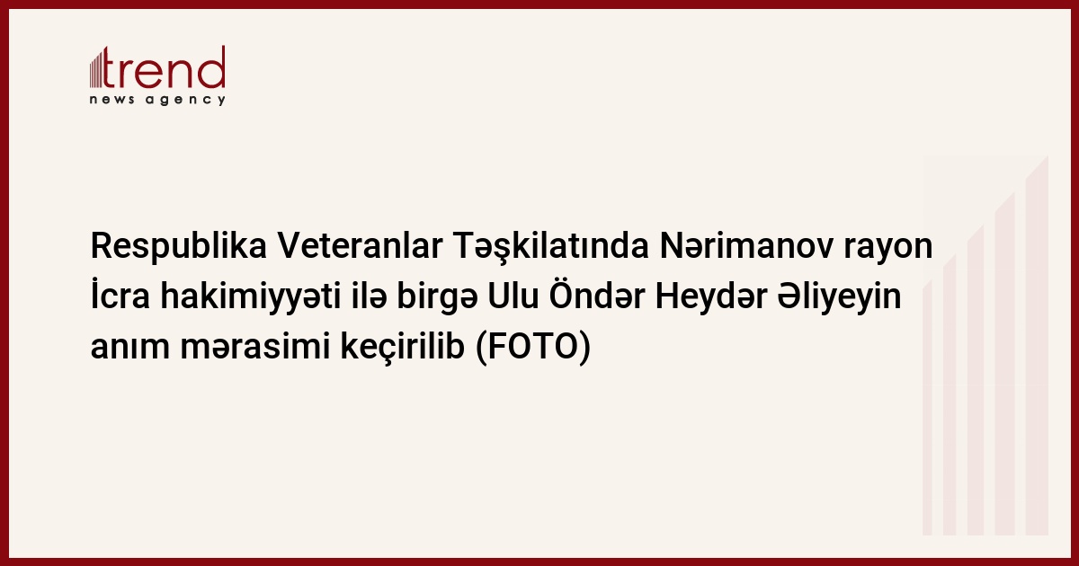 Respublika Veteranlar Təşkilatının inzibati binasının akt zalında Nərimanov rayon icra Hakimiyyətinin və Respublika Veteranlar Təşkilatının əməkdaşlarının, rayon ictimaiyyətinin nümayəmdələrinin, ziyalıların, veteranların, gənclərin iştirakı ilə Ulu Öndər Heydər Əliyevin anım mərasimi təşkil edilib.
