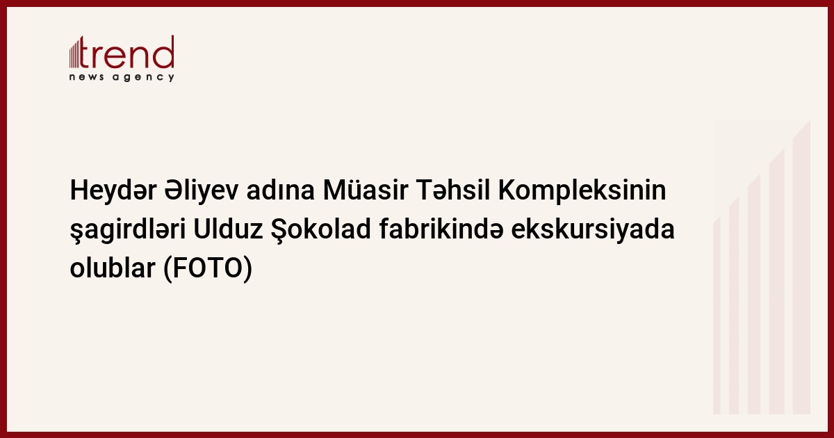 Heydər Əliyev adına Müasir Təhsil Kompleksinin 8-ci sinif şagirdləri və müəllim heyəti ilə Ulduz Şokolad fabrikində təşkil olunan ekskursiyada iştirak ediblər. Şagirdlər ilk öncə şokoladın istehsalı və tarixi barədə hazırlanmış videoçarxı izləyib, şokolad məhsullarının hazırlanma texnologiyası barədə ətraflı məlumat əldə ediblər.