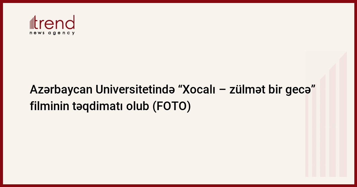 Azərbaycan Universitetinin tələbələri üçün “Xocalı – zülmət bir gecə” filminin təqdimatı keçirilib. Erməni Təcavüzünün Tanıdılması İctimai Birliyinin sədri, publisist Səriyyə Müslümqızının yeni layihəsi olan film Azərbaycan Respublikasının Prezidenti yanında Qeyri-Hökumət Təşkilatlarına Dövlət Dəstəyi Şurasının maliyyə dəstəyi ilə hazırlanıb. Filmdə Xocalı soyqırımında ermənilərin girovluğunda olan soydaşlarımızın ağlasığmaz işgəncələrə məruz qaldığı onların özü tərəfindən nəql edilir.