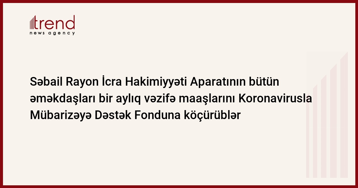 Aparatdan Trend-ə verilən məlumata görə, koronavirus (COVID-19) infeksiyasınını ölkəmizdə yayılmasının qarşısının alınması məqsədilə görülən işlərin daha da operativ həyata keçirilməsi ilə əlaqədar Səbail Rayon İcra Hakimiyyətinin başçısı Vuqar Zeynalov və Rayon İcra Hakimiyyəti Aparatının bütün əməkdaşları bir aylıq vəzifə maaşlarını Azərbaycan Respublikasının Prezidenti İlham Əliyevin “Azərbaycan Respublikasında əhalinin sağlamlığının qorunması və koronavirus infeksiyasına qarşı mübarizənin gücləndirilməsi ilə bağlı tədbirlər haqqında” 19 mart 2020-ci il tarixdə imzaladığı Fərmana əsasən yaradılmış Koronavirusla Mübarizəyə Dəstək Fonduna köçürüblər.