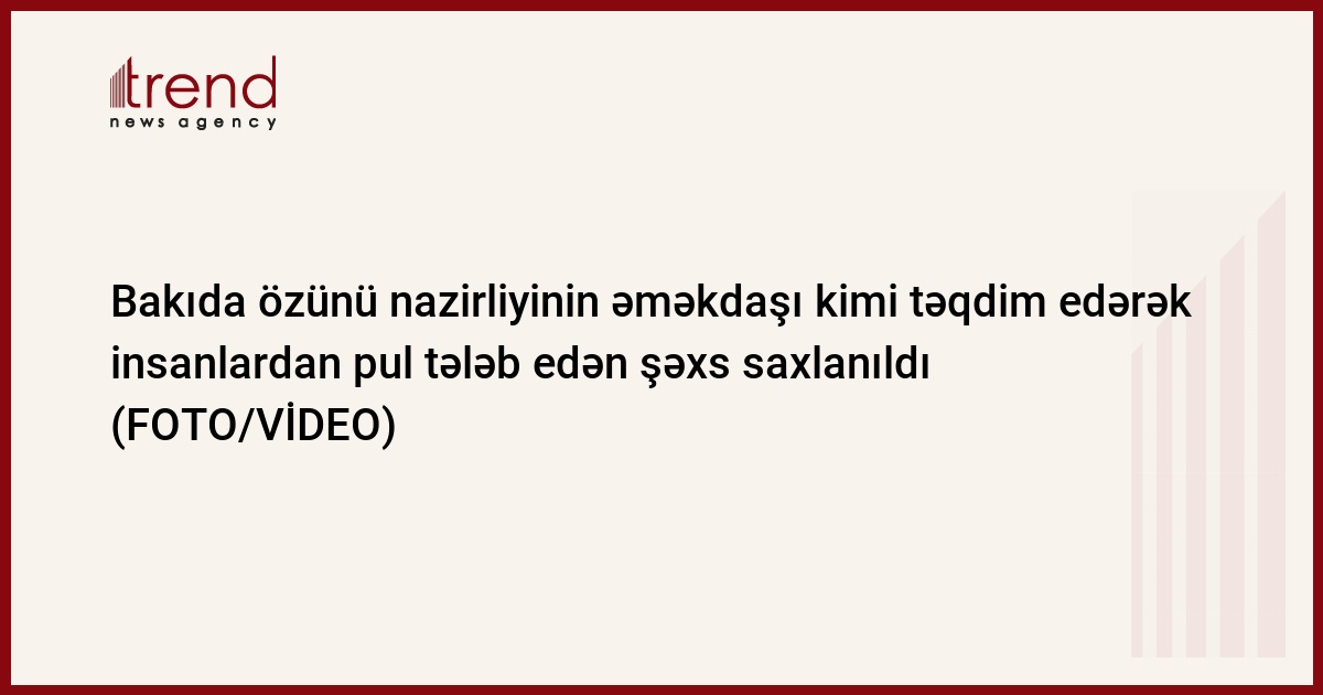 Daxili İşlər Nazirliyinin Mətbuat xidmətindən Trend-ə verilən məlumata görə, Nizami rayonunda ayrı-ayrı vətəndaşların evlərinə gedərək özünü guya Səhiyyə Nazirliyinin əməkdaşı kimi təqdim etməklə həmin şəxslərin yaşadıqları ünvanda dezinfeksiya işləri aparılacağını deyən və bu məqsədlə onlardan pul tələb edən şəxs saxlanılıb.