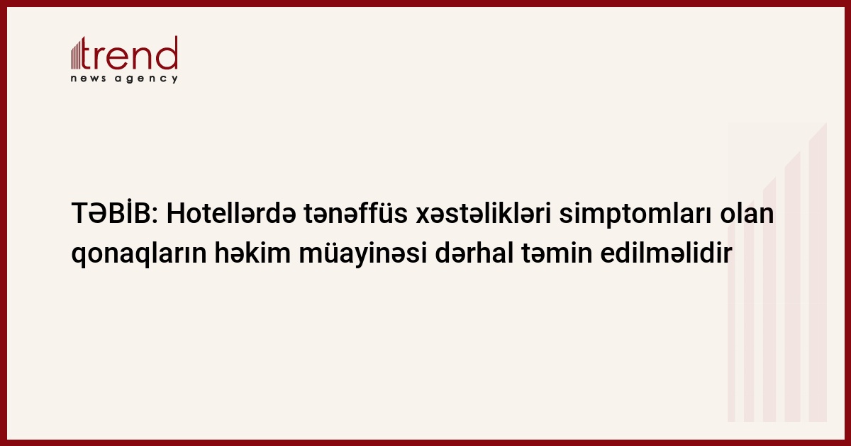 Trend-in məlumatına görə, bu məlumatlar Tibbi Ərazi Bölmələrini İdarəetmə Birliyinin (TƏBİB) turizm və otelçilik sektorunda koronavirus (COVID-19) infeksiyasının idarə olunmasına dair hazırladığı metodiki göstərişlərdə əks olunub.