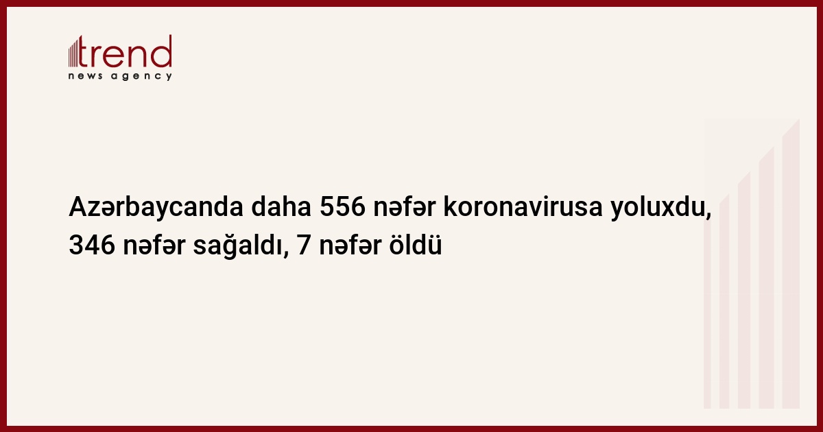 Azərbaycanda 556 yeni koronavirus infeksiyasına yoluxma faktı qeydə alınıb, 346 nəfər müalicə olunaraq sağalıb və evə buraxılıb.