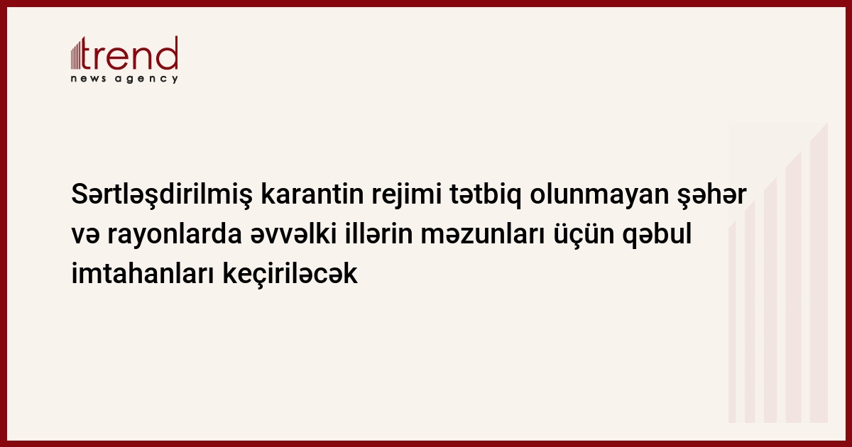 Dövlət İmtahan Mərkəzi iyulun 10-da karantin rejimi sərtləşdirilməyən şəhər və rayonlarda əvvəlki illərin məzunları üçün I-IV ixtisas qrupları üzrə ali təhsil müəssisələrinin qəbul imtahanının birinci mərhələsi, həmçinin V ixtisas qrupu və 11 illik bazada kolleclərə qəbul imtahanı keçirəcək.