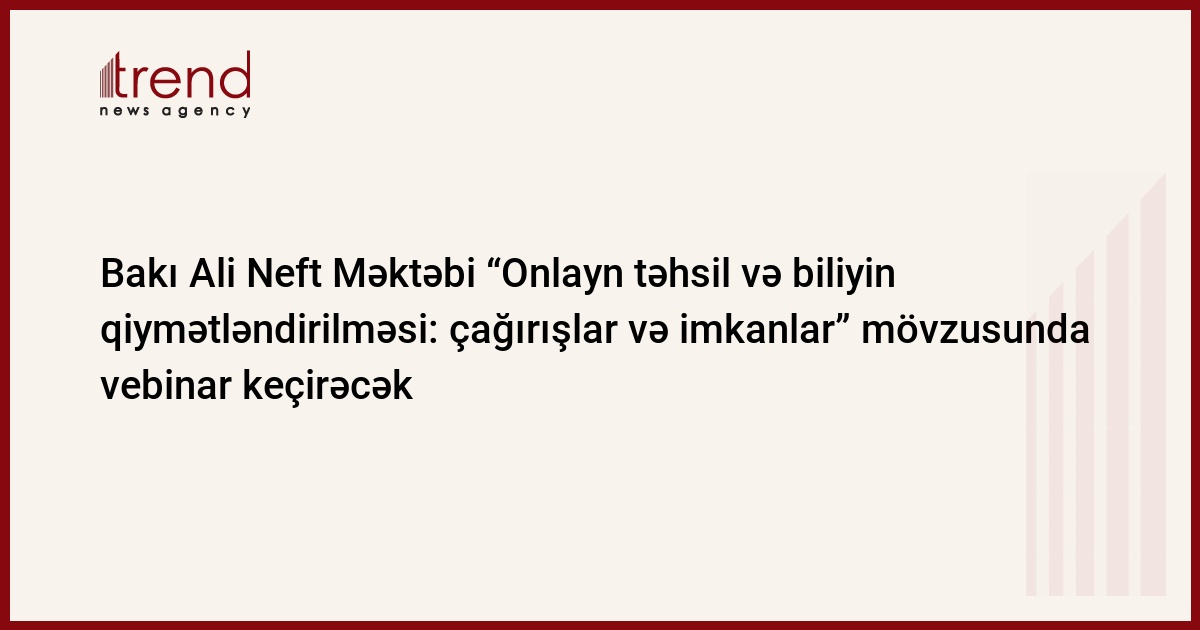 Bakı Ali Neft Məktəbi (BANM), İstanbul Texniki Universiteti (İTU) və Azərbaycan Dövlət İqtisad Universitetinin (UNEC) birgə təşkilatçılığı ilə COVID-19 pandemiyası dövründə “Onlayn təhsil və biliyin qiymətləndirilməsi: çağırışlar və imkanlar” mövzusunda vebinar keçiriləcək. “Zoom” platforması üzərindən təşkil olunacaq vebinarda pandemiya dövründə məsafədən tədrisin və onlayn qiymətləndirmənin keyfiyyətli şəkildə təşkili ilə bağlı təqdimatlar olacaq və fikir mübadiləsi aparılacaq.