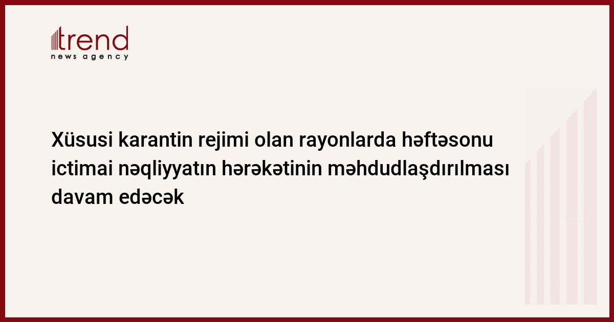 Nazirlər Kabineti yanında Operativ Qərargahdan Trend-ə verilən məlumata görə, COVID-19 infeksiyasına yoluxma dinamikası nəzərə alınmaqla 2020-ci il 31 avqust saat 00:00-dək sərtləşdirilmiş xüsusi karantin rejimi tətbiq olunacağı Bakı, Cəlilabad, Gəncə, Masallı, Mingəçevir, Sumqayıt, Yevlax şəhərləri və Abşeron, Bərdə, Goranboy, Göygöl, Xaçmaz, Salyan rayonlarında həftəsonu ictimai nəqliyyatın hərəkəti məhdudlaşdırılması davam edəcək