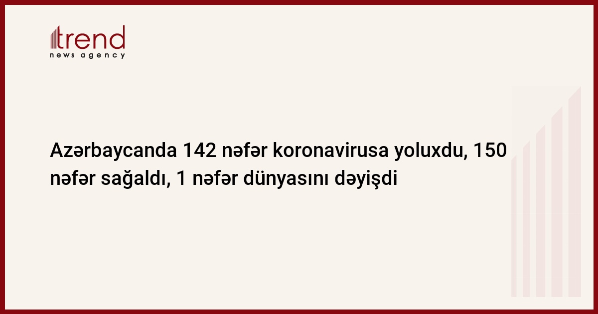 Azərbaycanda koronavirus (COVID-19) infeksiyasına 142 yeni yoluxma faktı qeydə alınıb, 150 nəfər müalicə olunaraq sağalıb və evə buraxılıb.
