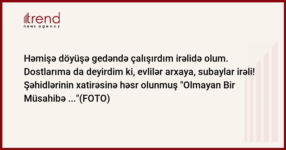 Bakı. Trend: Azərbaycan yazıçı Nərminə Məmmədzadə Trend Life-a ikinci Qarabağ müharibəsi şəhidlərinin xatirəsinə həsr olunmuş "Olmayan Bir Müsahibə ..." adlı silsilə materiallar təqdim edir.