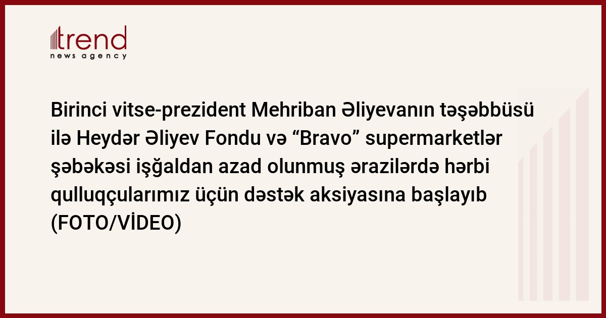 Azərbaycan Respublikasının Birinci vitse-prezidenti Mehriban xanım Əliyevanın təşəbbüsü ilə Heydər Əliyev Fondu və “Bravo” supermarketlər şəbəkəsi işğaldan azad olunmuş ərazilərdə xidmət edən hərbi qulluqçularımız üçün yeni dəstək aksiyasının həyata keçirilməsinə başlayıb.