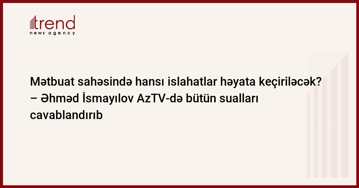 Trend-in məlumatına görə, Azərbaycan Televiziyasının (AzTV) “Hədəf” proqramının qonağı olan yeni yaradılan qurumun İcraçı direktoru Əhməd İsmayılov rəhbərlik etdiyi agentliyin fəaliyyət istiqamətlərindən danışıb. MEDİA-nın jurnalistikanın inkişafında görəcəyi işlərdən danışan Ə.İsmayılov deyib ki, əsas məqsəd mətbuatda islahatların dərinləşdirilməsi, jurnalistlərin peşəkarlığının artırılması, onların sosial vəziyyətinin yaxşılaşdırılmasına yardım etməkdir. Eyni zamanda, mətbuat orqanlarının nüfuzunun qaldırılmasına, biznes subyektinə çevrilməsinə yardım ediləcək. Proqramda Ə.İsmayılov mətbuat sahəsində aparılacaq islahatlarla bağlı vacib sualların hər birinə ayrı-ayrılıqda cavab verib.