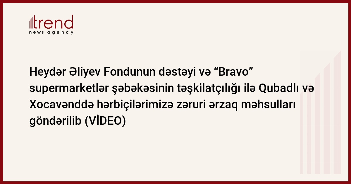 Trend xəbər verir ki, Azərbaycanın Birinci vitse-prezidenti Mehriban Əliyevanın təşəbbüsü, Heydər Əliyev Fondunun dəstəyi və "Bravo" supermarketlər şəbəkəsinin təşkilatçılığı ilə bir neçə aydır davam edən dəstək aksiyası çərçivəsində növbəti dəfə Qubadlı rayonunda xidmət edən hərbi qulluqçularımıza zəruri ərzaq məhsulları göndərilib.