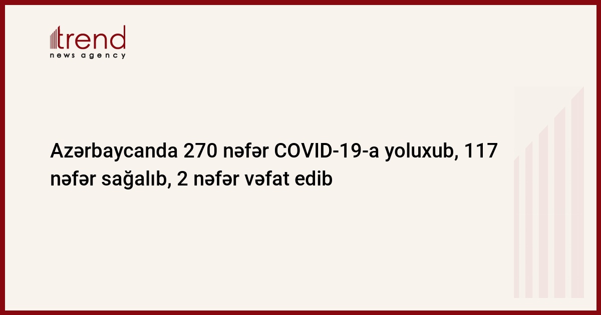 Azərbaycan Respublikasında koronavirus (COVID-19) infeksiyasına 270 yeni yoluxma faktı qeydə alınıb, 117 nəfər müalicə olunaraq sağalıb.
