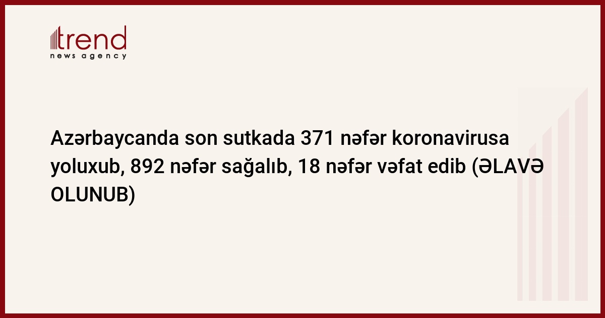 Azərbaycan Respublikasında koronavirus (COVID-19) infeksiyasına 371 yeni yoluxma faktı qeydə alınıb, 892 nəfər müalicə olunaraq sağalıb.
