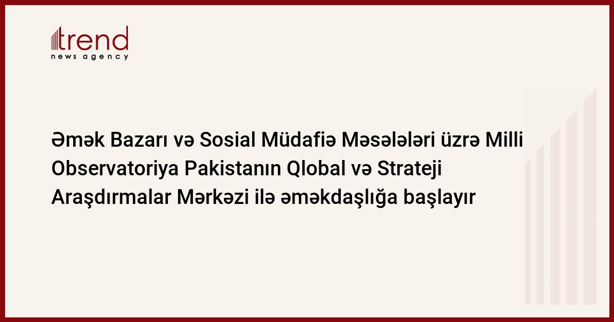 Əmək və Əhalinin Sosial Müdafəsi Nazirliyinin tabeliyindəki Əmək Bazarı və Sosial Müdafiə Məsələləri üzrə Milli Observatoriya ilə Pakistanın Qlobal və Strateji Araşdırmalar Mərkəzi (CGSS) fəaliyyət sahələri üzrə əməkdaşlıq həyata keçirəcəklər.