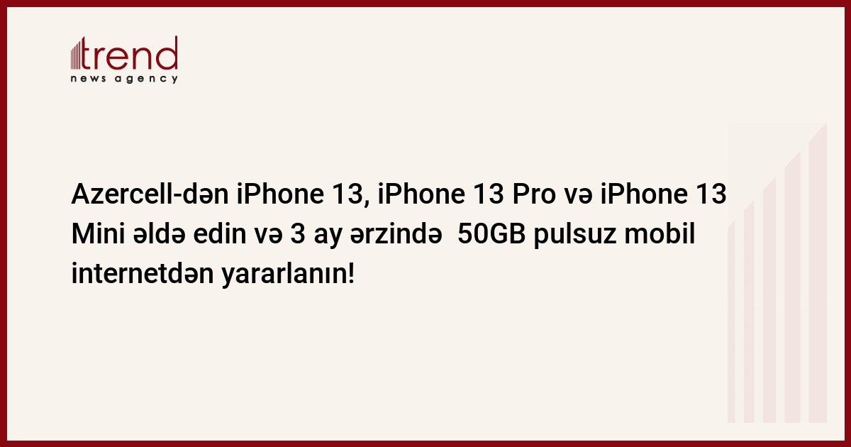 Azercell böyük məmnuniyyətlə oktyabrın 15-dən etibarən uzun müddətdir gözlənilən iPhone 13, iPhone 13 Pro və iPhone 13 Mini smartfonlarının Azercell-in satış mərkəzlərində müştərilərə təqdim olunacağını elan edir. Ölkə ərazisini yüksək keyfiyyətli 4G şəbəkəsi ilə təmin edən Azercell Apple şirkətinin istehsal etdiyi ən yeni nəsil cihazlar ilə inanılmaz sürətdən zövq almaq imkanı yaradır. Belə ki, Azercell-in Eksklüziv mağazalarından iPhone 13, iPhone 13 Pro və iPhone 13 Mini smartfonları əldə edən müştərilərə ölkənin aparıcı mobil operatoru tərəfindən 3 ay müddətində 50GB həcmində internet paketi hədiyyə olunacaq.