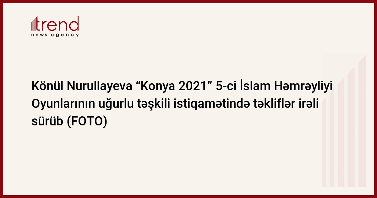 İslam Həmrəyliyi İdman Federasiyası (İHİF) İcraiyyə Şurasının və Nəzarət və Koordinasiya Komitəsinin üzvü olan Könül Nurullayeva “Konya 2021” 5-ci İslam Həmrəyliyi Oyunlarının Təşkilat Komitəsi ilə birgə yarışların keçiriləcəyi şəhərdə hazırlıqların gedişatı ilə tanışlıq məqsədilə təşkil olunan toplantıda iştirak edib.