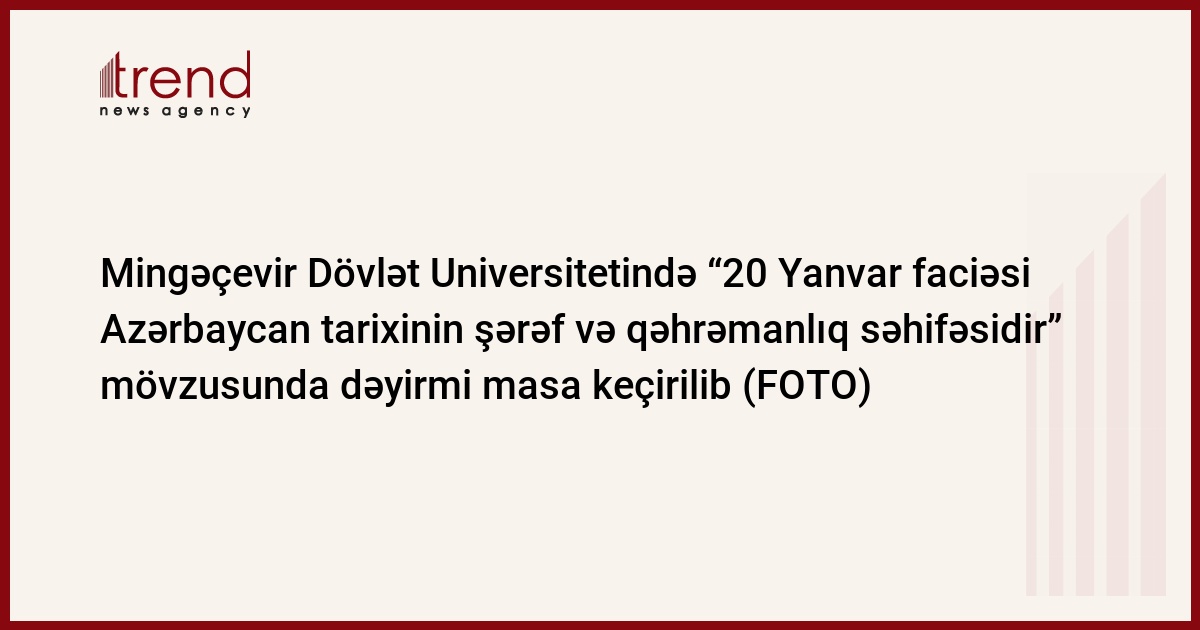 17 yanvar 2022-ci il tarixində Mingəçevir Dövlət Universitetində (MDU) “20 Yanvar faciəsi Azərbaycan tarixinin şərəf və qəhrəmanlıq səhifəsidir” mövzusunda dəyirmi masa keçirilib. Dəyirmi masada akademik və inzibati heyət üzvləri, tələbə və magistrantlar iştirak ediblər.