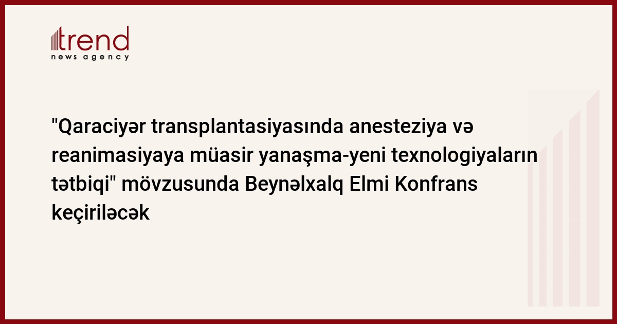 Qaraciyər transplantasiyasında anesteziya və reanimasiyaya dair müasir yanaşmaların, eləcə də yeni texnologiyaların tətbiqi ilə bağlı məruzələrin dinləniləcəyi Beynəlxalq Elmi Konfrans ZOOM platforması üzərindən onlayn şəkildə həyata keçiriləcək.