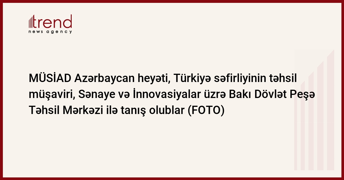 Qeyd edək ki, bu il yanvarın 28-də MÜSİAD Azərbaycan, Sənaye və İnnovasiyalar üzrə Bakı Dövlət Peşə Təhsil Mərkəzi arasında iş birliyinin perspektivlərini müzakirə edib.