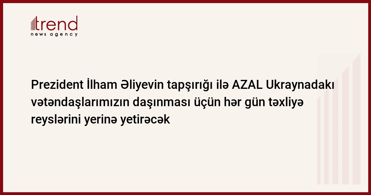 Azərbaycan Respublikasının Prezidenti İlham Əliyevin tapşırığı ilə AZAL aviaşirkəti Ukraynadakı hadisələrlə əlaqədar Vətənə qayıtmaq arzusunda olan həmvətənlərin daşınması üçün hər gün təxliyə reyslərini yerinə yetirəcək.