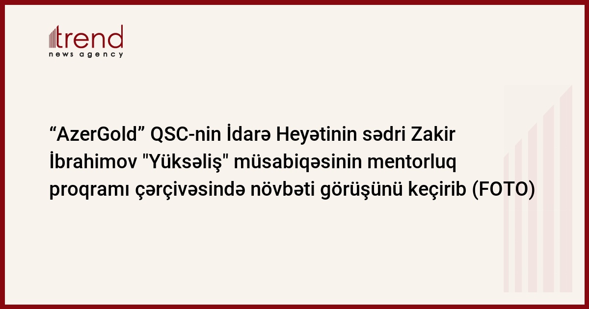 “AzerGold” Qapalı Səhmdar Cəmiyyətinin (QSC) İdarə Heyətinin sədri Zakir İbrahimov “Yüksəliş” müsabiqəsinin mentorluq proqramı çərçivəsində layihənin qaliblərindən biri olan Nazim Novruzovla görüşüb.