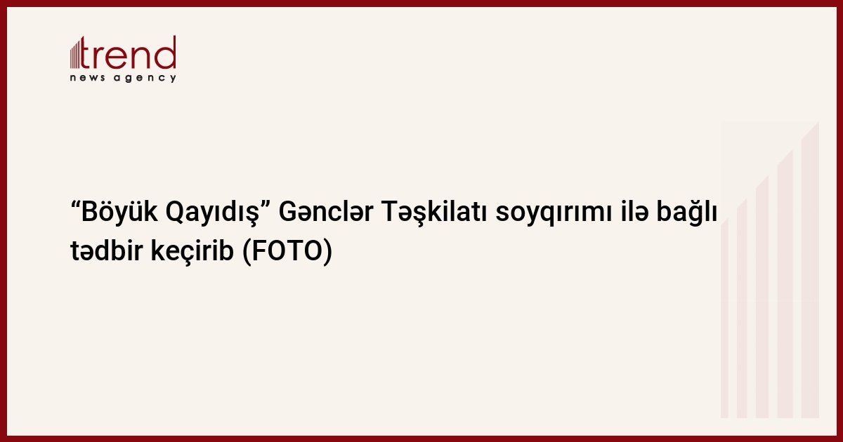 Martın 30-da “Böyük Qayıdış” Gənclər Təşkilatı tərəfindən Milli Azərbaycan Tarixi Muzeyində 31 Mart - Azərbaycanlıların Soyqırımı Günü ilə əlaqədar “1918-ci il 31 mart soyqırımı gerçəkləri” adlı tədbir keçirilib. Tədbir tariximizin ən qanlı səhifələrindən biri olan ermənilərin azərbaycanlılara qarşı törətdiyi 31 mart soyqırımı qurbanlarının əziz xatirəsini yad etmək, baş vermiş qırğınlar və soyqırımı gerçəkləri haqqında məlumatları tarixi faktlarla gənclərə çatdırmaq məqsədilə təşkil olunub.