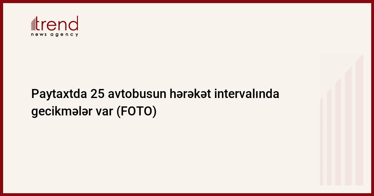 Vahid Dispetçer Xidmətindən Trend-ə verilən məlumata görə, bu gün səhər pik saatlarına olan məlumatına əsasən paytaxtın müxtəlif ərazilərində müşahidə olunan nəqliyyat sıxlıqları səbəbindən 18 müntəzəm marşrut xətti üzrə 25 avtobusun hərəkət intervalında gecikmələr var.